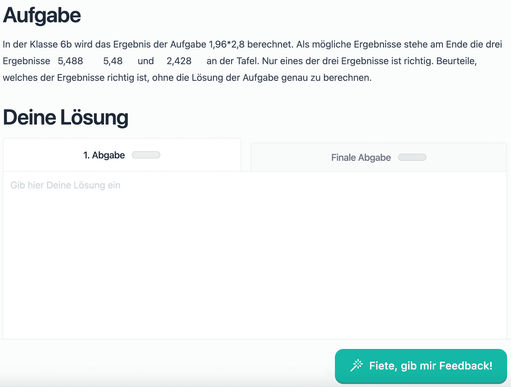 Etwas neidisch habe ich daher auf das neue und KI-gestützte Tool Fiete geschaut. Fiete liefert laut Aussage der Entwickler in Windeseile ein individualisiertes und KI-gestütztes Feedback zu Schüler*innentexten und -aufgaben. Anstatt nach einem einheitlichen Schema vorzugehen, passe sich das Feedback an die Vorgaben und Kriterien an, die wir Lehrkräfte festlegen. Das klingt doch toll, allerdings ist Fiete - zumindest auf den ersten Blick - eher etwas für den Deutsch-, Fremdsprachen-, Geschichts- oder Politikunterricht. Dachte ich...