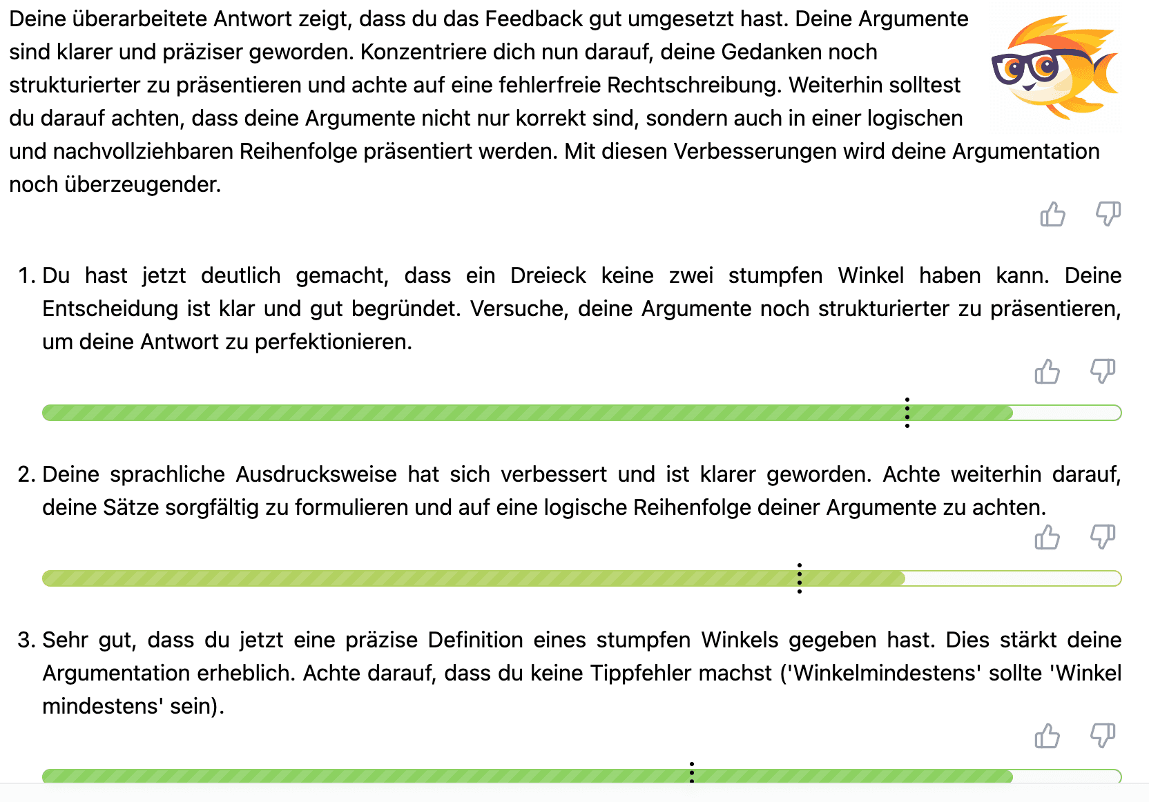 Schnell zeigte sich im Unterricht die Magie von Fiete: Die Schüler*innen reichten ihre mathematischen Argumentationen ein und erhielten nach nur ein bis zwei Minuten eine Rückmeldung – nicht nur ein „Richtig“ oder „Falsch“, sondern konstruktive und kriteriengeleitete Hinweise darauf, was gut war und was verbessert werden kann.