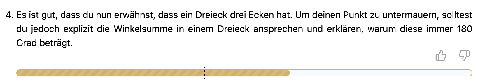 Interessanterweise waren sogar Schüler*innen, die sonst nicht gerne Texte schreiben, motiviert dabei. Bei ihnen war zu beobachten, dass aus der ersten Eingabe, die nur aus einem einzigen Satz bestand („Die Aussage ist falsch, weil ein stumpfer Winkel immer größer als 90° ist.“), in der Überarbeitung tatsächlich deutlich längere, bessere oder sogar gute Begründungen wurden.