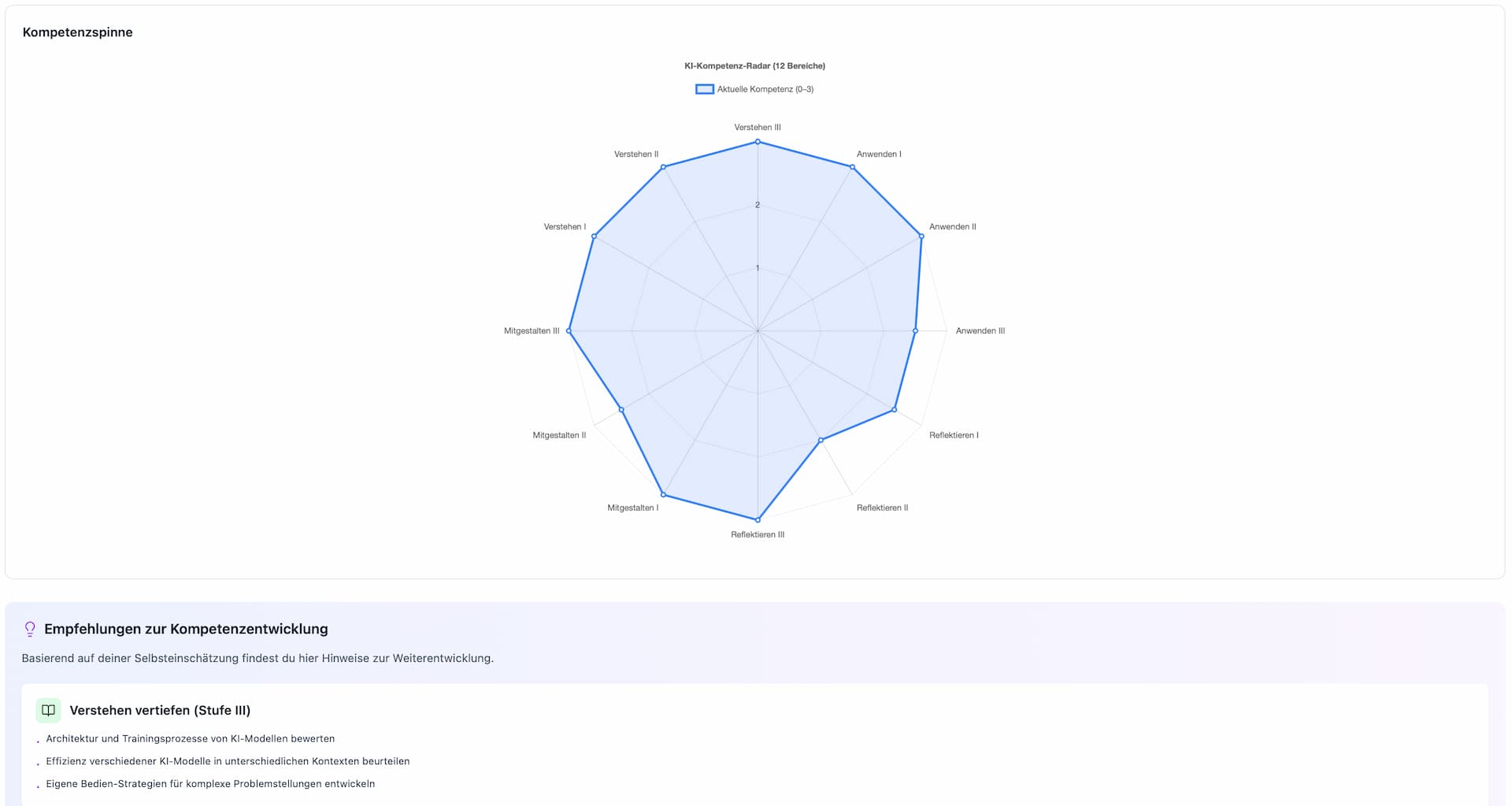 Nach der Selbsteinschätzung erhalten Nutzer:innen ein individuelles Kompetenzprofil mit einer Visualisierung ihrer Stärken und Entwicklungsfelder sowie konkreten, passgenauen Handlungsempfehlungen für die nächsten Schritte. Die Ergebnisse lassen sich in verschiedenen Formaten (PDF, DOCX, CSV) exportieren – für die eigene Dokumentation oder zur Weiterarbeit mit den ergänzenden Tools.