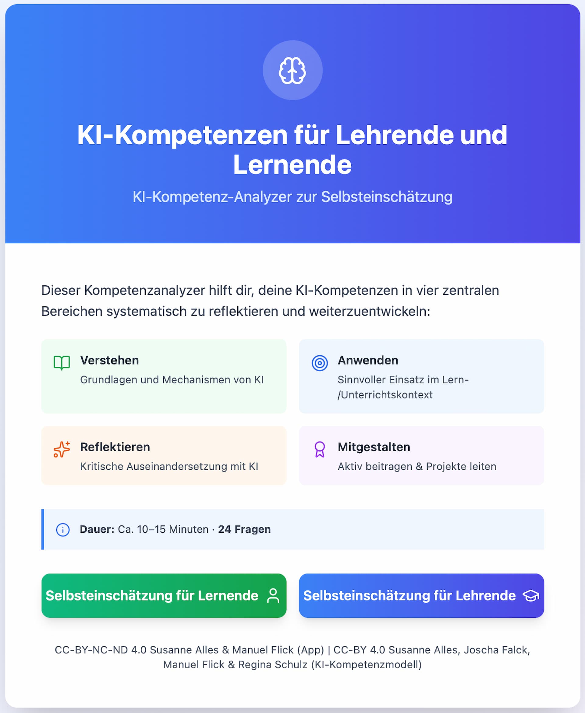 Grundlage aller Tools ist das [KI-Kompetenzmodell für Lehrende und Lernende] https://zenodo.org/records/15047793 (Alles, Falck, Flick & Schulz, 2025), das vier zentrale Bereiche umfasst:
