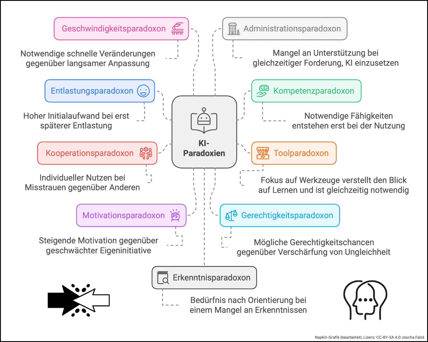 Während KI-Systeme das Potenzial haben, Lernprozesse zu verbessern und Lehrkräfte zu entlasten, treten im Schulalltag paradoxe Effekte auf: Entlastung, Kompetenzen, Motivation und einige andere Bereiche stehen in einem oft widersprüchlichen Verhältnis zu den Erwartungen. Mit Blick auf diese Widersprüche wird mir zunehmend klarer, warum es so schwierig ist, KI „in die Fläche“ zu bringen. Ob wir sie auflösen können, vermag ich derzeit nicht zu beurteilen. Möglicherweise ist es ein Teil des kollektiven Lernprozesses, mit den folgenden Paradoxien umzugehen bzw. sie zumindest auszuhalten.