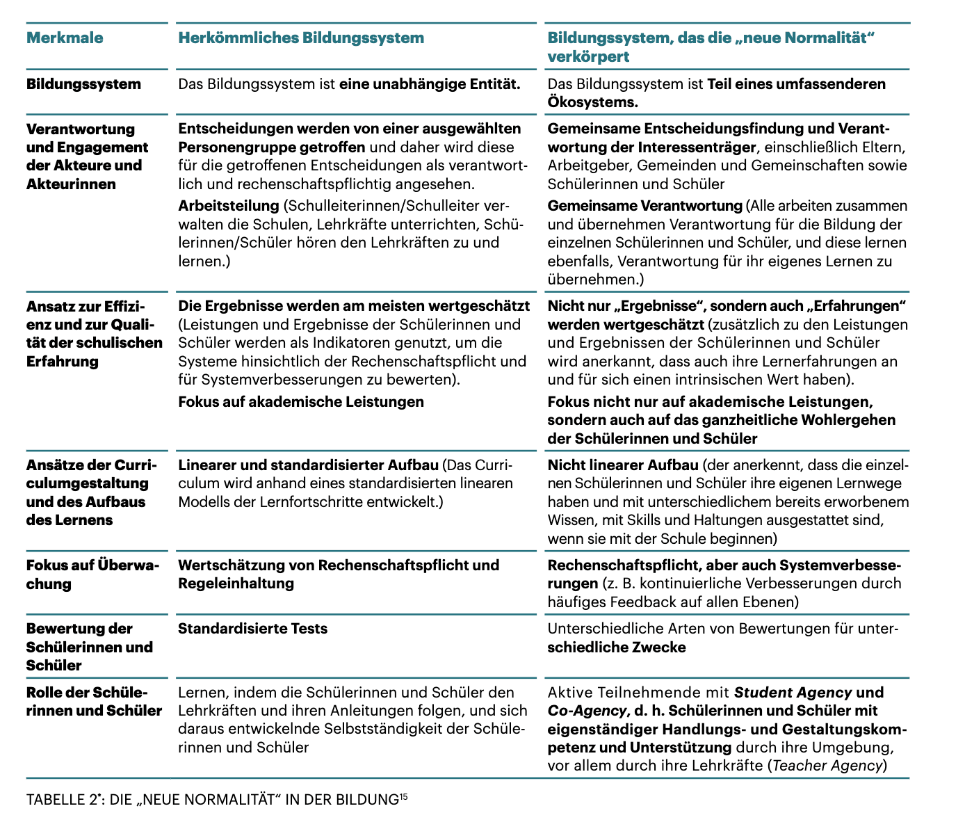 In der „neuen Normalität“ des Bildungssystems steht die gemeinschaftliche Entscheidungsfindung und eine geteilte Verantwortung für die Bildung der Lernenden im Vordergrund. Hierbei wird nicht nur Wert auf die Ergebnisse gelegt, sondern auch auf die Lernerfahrungen selbst. Jede:r Lernende verfolgt einen individuellen Lernweg, der auf bereits erworbenem Wissen, Fähigkeiten, Haltungen und Werten basiert. Die aktive Beteiligung der Lernenden ist hierbei von zentraler Bedeutung. Sie übernehmen durch ihre eigene Handlungs- und Gestaltungskompetenz (Student Agency) und mit Unterstützung ihrer Umgebung (Co-Agency) Verantwortung. Lehrkräfte schaffen den dafür notwendigen Rahmen (Teacher Agency). Wir befinden uns also in einem Spannungsverhältnis zwischen dem herkömmlichen Bildungssystem und dem Bildungssystem des 21. Jahrhunderts, das die „neue Normalität“ verkörpert (vgl. OECD, 17):