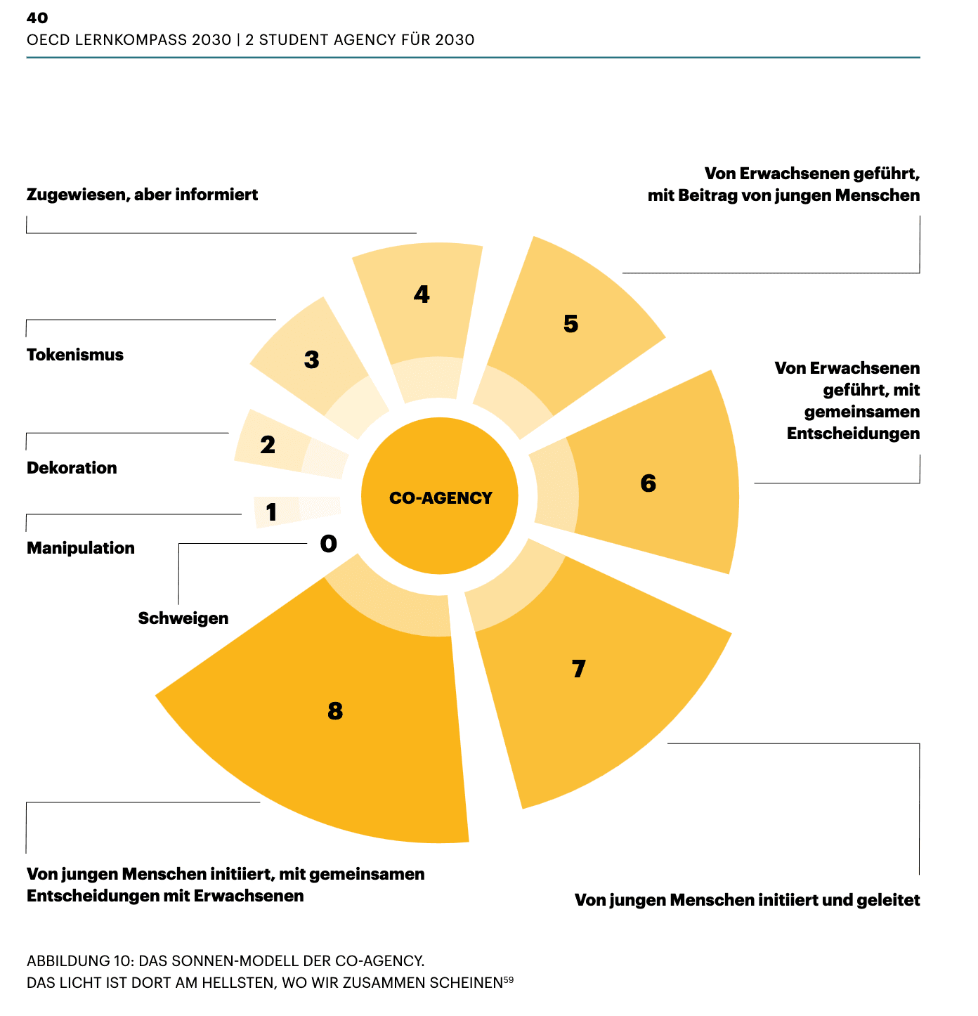 Co-Agency und die damit verbundenen lernförderlichen Umgebungen sind auch Voraussetzungen für gelingendes Peer Feedback. Feedback sollte in einer unterstützenden und respektvollen Atmosphäre stattfinden, geprägt von Vertrauen und starken zwischenmenschlichen Beziehungen. Das Sonnenmodell des OECD Lernkompasses, das gemeinsam mit Lernenden entwickelt wurde, definiert Stufen von Co-Agency. Insbesondere in den Stufen 6-8, in denen echte Co-Agency stattfindet, wird die Bedeutung einer förderlichen Lernumgebung für erfolgreiches (Peer) Feedback besonders deutlich.