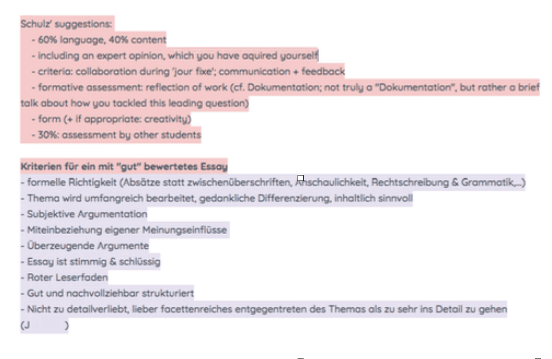 Zur kollaborativen Sammlung von Feedbackkriterien nutzen wir ein zumpad. Behördliche Vorgaben bringe ich (hier: rot) ein, die Lernenden (hier: lila) bisher gelernte Kriterien und Erfahrungen: