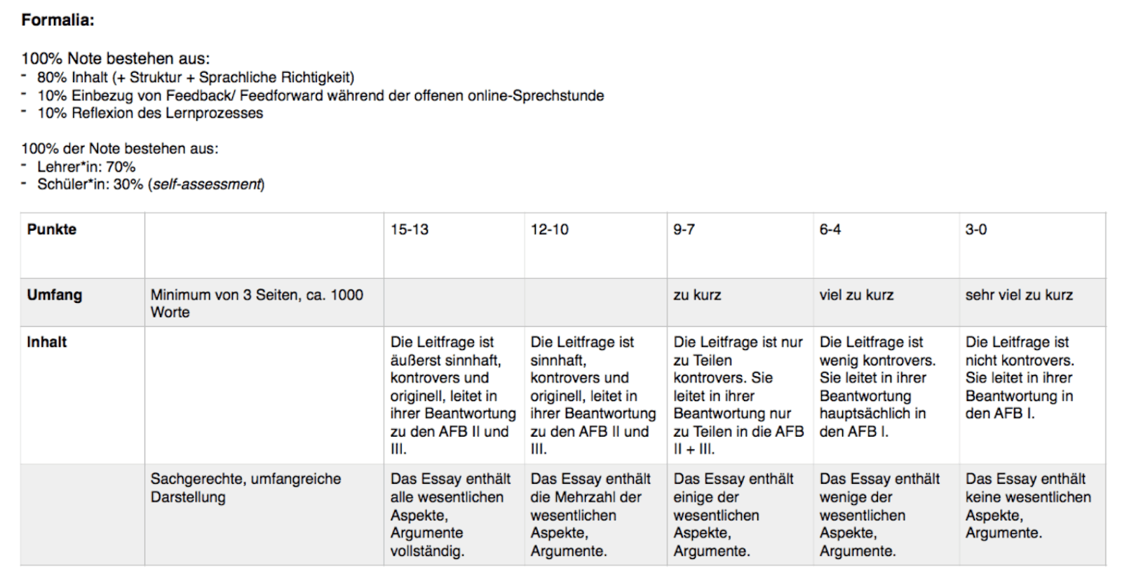 Vorbereitung | (Skalen kollaborativ festlegen) | Für jedes Kriterium können Skalen entwickelt werden, die von den Lernenden verwendet werden, um ihren Peers differenziertere Rückmeldungen zu geben. | Punkteskalen, Beschreibungen, Kompetenzraster, … |