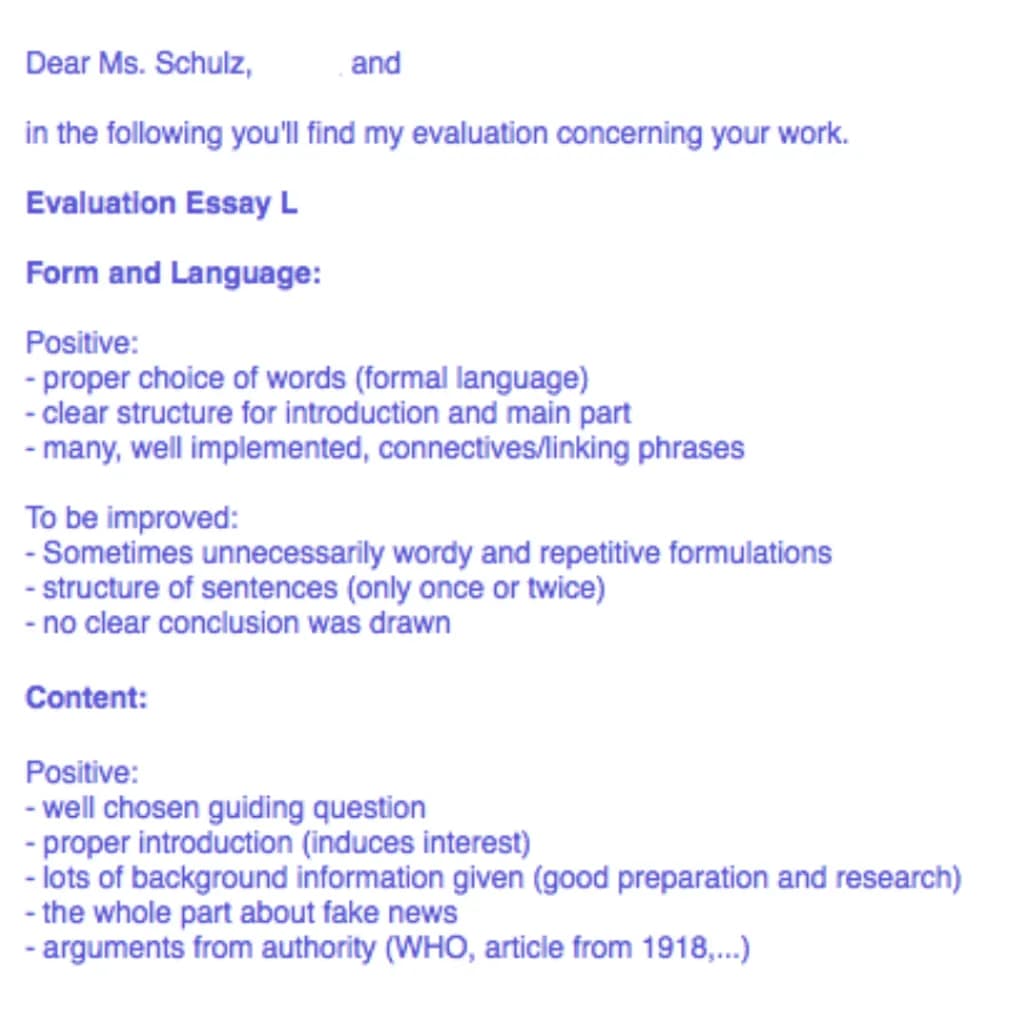 „Dear Mrs Schulz, here is my essay, my self-self-reflection and the audio of the interview with my grandpa. I hope you enjoy it. I can only say it again, I truly loved it and it was the best final exam I could do and hand in. I learned so so so much and enjoyed every single step of the process. I really do look forward to your feedback! Kind regards,“