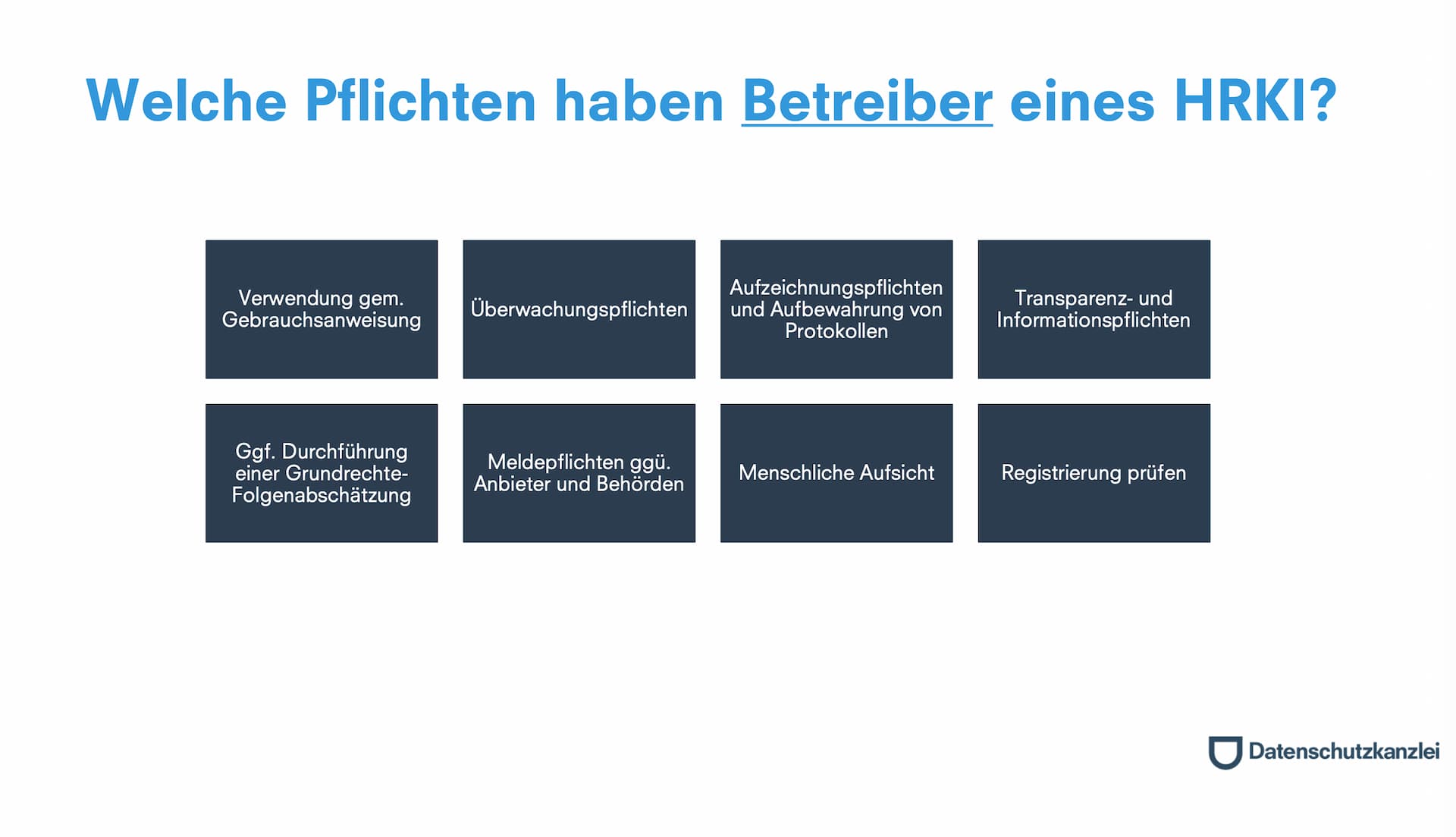 Wichtig ist dabei die Rollenverteilung. Rechtlich gesehen ist die Schule (bzw. der Schulträger oder die Schulleitung, je nach Bundesland) der "Betreiber" der KI, da dort die Entscheidungsgewalt über Einsatz und Finanzierung liegt. Schulen haben damit als Betreiber auch bestimmte Pflichten, abhängig vom Risikograd des KI-Systems. Sofern einer der genannten Hochrisiko-KI-Anwendungsfälle greift, müssen Schulen eine Reihe von Anforderungen erfüllen (siehe Abbildung 2):