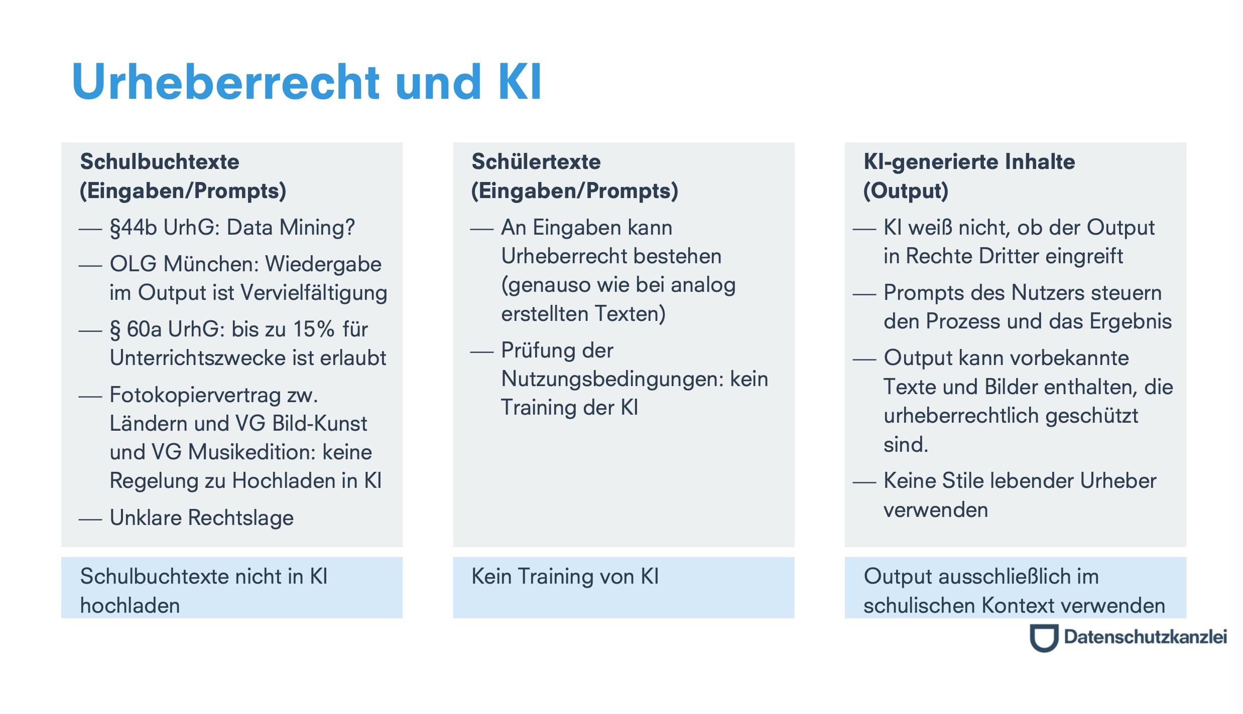 Immer mehr Lehrkräfte generieren Texte, Schaubilder, Aufgaben mit Sprachmodellen, um diese Materialien im Unterricht zu nutzen. Der Prompt der Lehrkräfte ist dabei entscheidend, ob ggf. in Rechte Dritter eingegriffen wird. Die KI weiß nicht, ob der Output in Rechte Dritter eingreift. Die Prompts des Nutzers steuern den Prozess und das Ergebnis. Der KI-Output kann vorbekannte Texte und Bilder enthalten, die urheberrechtlich geschützt sind. Laut einer aktuellen Gerichtsentscheidung des OLG München können KI-Outputs in die Urheberrechte von Dritten eingreifen. Aus diesem Grund sollten Lehrkräfte vermeiden, die KI aufzufordern, Stile, Werke etc. lebender Urherber:innen zu verwenden.