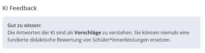 Es ist für mich und meine Schüler:innen intransparent, nach welchen internen Kriterien die KI-basierten Anwendungen ein Feedback bzw. eine Bewertung vornehmen. Den der Schülerlösung zugrundeliegenden Text ‚kennen‘ sie nicht, ebenso wenig ‚verstehen‘ sie den Schülertext.
