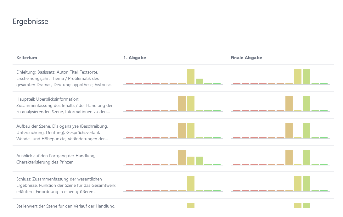 Sofort kann ich wieder durch die farbigen Balken erkennen, was Fiete.ai positiv auffällt und was verbessert werden könnte. Dass die finale Version offenbar als besser eingeschätzt wird, zeigt mir die Linie aus schwarzen Punkten. Das finde ich motivierend. Das Feedback ist mit bis zu drei Sätzen pro Kriterium übersichtlich, wertschätzend, zudem verständlich formuliert und passend, jedoch wenig spezifisch. Anders als bei PEER erhalte ich für denselben Schülertext, den ich einen Tag später unter anderem Namen eingebe, dieselbe Rückmeldung. In der Schüleransicht wäre eine Möglichkeit zum Herunterladen des Feedbacks gut. Die Abgaben meiner Schüler:innen kann ich mir in der Lehreransicht gesondert anzeigen lassen, wobei ich einen Überblick über die erste Abgabe und die finale Abgabe erhalte.