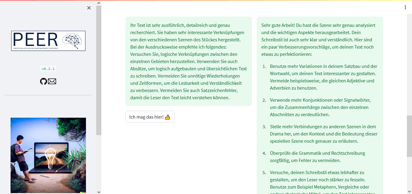 „PEER ist ein Projekt des Lehrstuhls für Human-Centered Technologies for Learning an der TUM. Ziel des Projektes ist es Schüler von der Grundschule bis zur Universität beim Erstellen von Aufsätzen aller Art zu unterstützen. Die Texte werden mit Unterstützung von KI untersucht und es wird ein möglichst konstruktives Feedback erzeugt. Alle Aufsatzdaten werden anonymisiert erfasst, um PEER stetig zu verbessern. Quelle: https://peer.edu.sot.tum.de/“