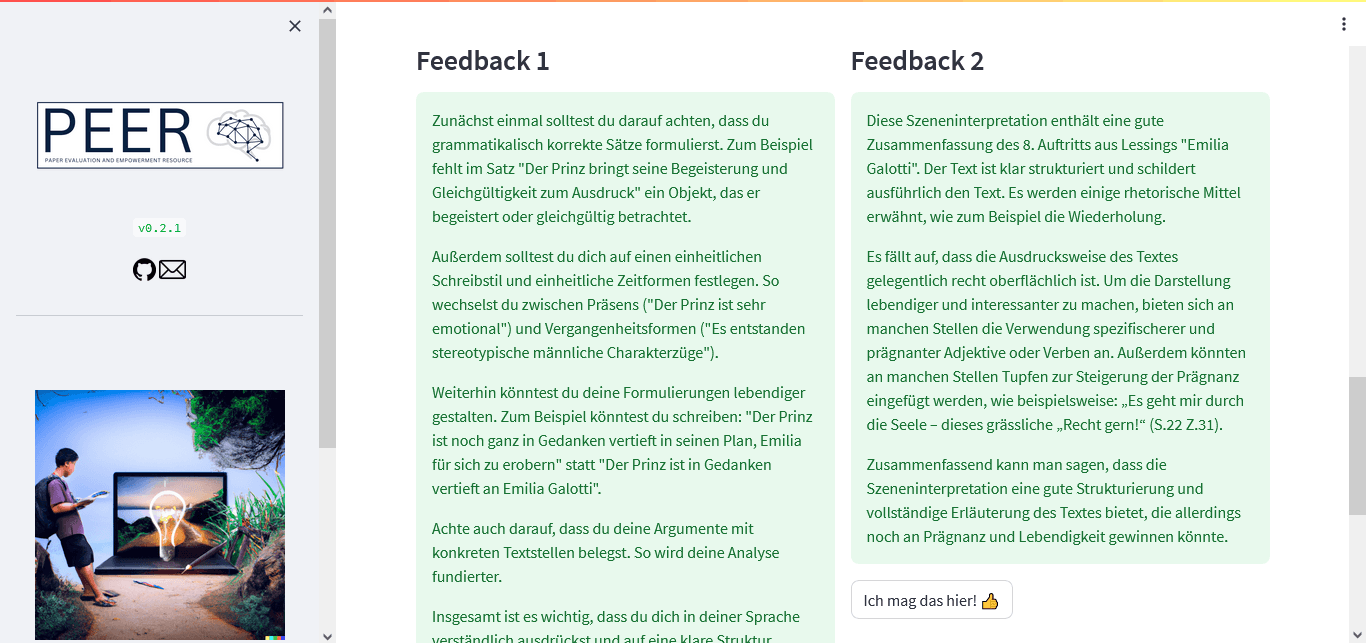 Das Feedback erfolgt sehr, sehr schnell, ich erhalte zwei unterschiedliche Rückmeldungen. Mit dem Klick auf einen Button („Ich mag das hier!“) kann ich das Feedback ‚liken‘. Zudem kann ich den Text anschließend überarbeiten und wieder neu bewerten lassen. Damit ermöglicht PEER jedem die Begleitung eines individuellen Schreibprozesses.