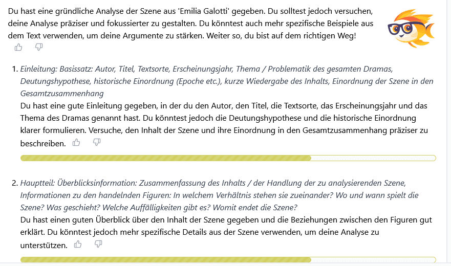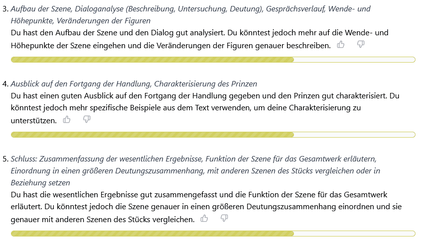 Auf einen Blick kann ich erkennen, was laut Fiete.ai gut bzw. weniger gut gelungen ist: farbige Balken (sogenannte ‚Fortschrittsbalken‘) zeigen das an (hier: unterschiedliche gelb bzw. grün gefüllte Balken). Mit dem Klick auf ‚Weiter‘ komme ich zurück ins Bearbeitungsfenster und kann meine Lösung verbessern, bevor ich sie endgültig abgebe. Das mache ich.